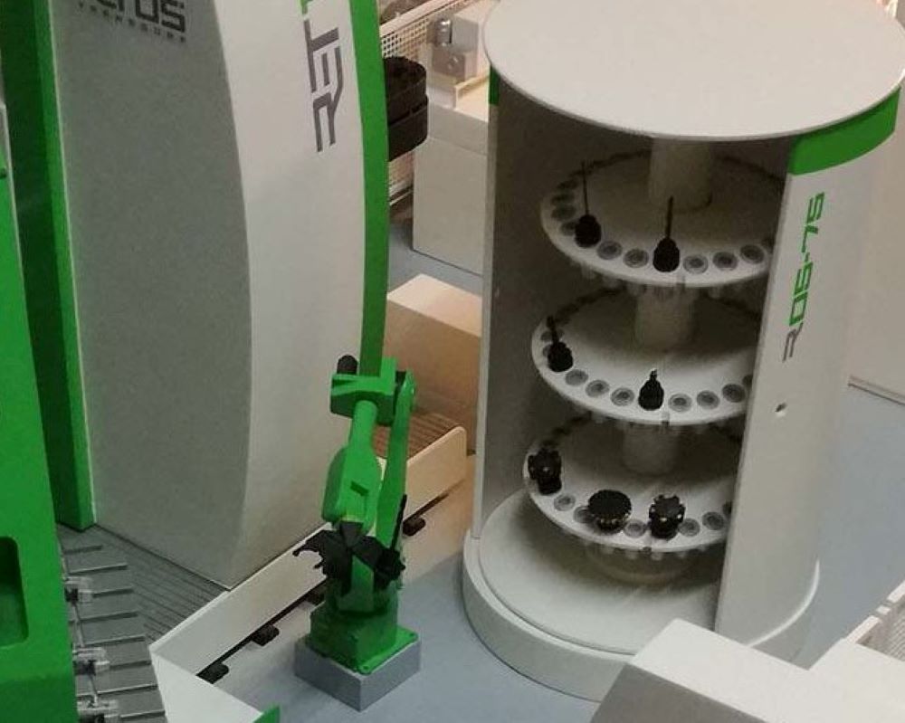 Die automatische Werkzeugwechselanlage besteht aus zwei Hauptbaugruppen– einem Roboter mit einem Kopf für den Transport von 2 Werkzeugen und einem Werkzeugspeicher.